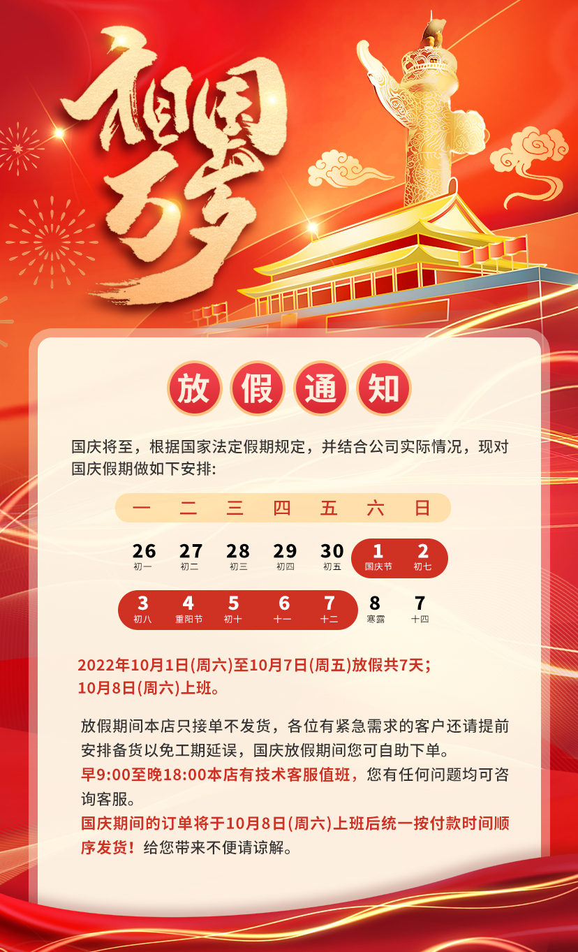 放假期間本店只接單不發(fā)貨,各位有緊急需求的客戶還請?zhí)崆鞍才艂湄浺悦夤て谘诱`,國慶放假期間您可以自助下單。早9:00至晚18:00本店有技術(shù)客服值班,您有任何問題均可咨詢客服。國慶期間的訂單將于10月8日(周六)上班后統(tǒng)一按付款時(shí)間順序發(fā)貨!給您帶來的不便請諒解。