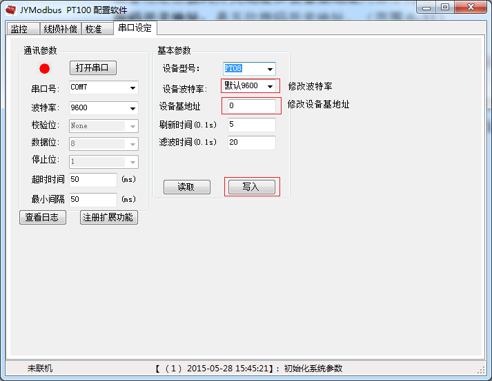 打開采集配置軟件,選擇串口設定菜單,在通訊參數中點擊關閉串口,選擇相應的串口號和波特率(默認9600),超時時間和最小間隔都改成50ms。基本參數中設備型號選擇PT08。點擊打開串口 ,點擊 讀取 按鈕,在下邊信息欄中顯示讀取成功,則表示聯機成功,(若顯示通信失敗,請確定串口接線,串口號,波特率和地址是否正確)。