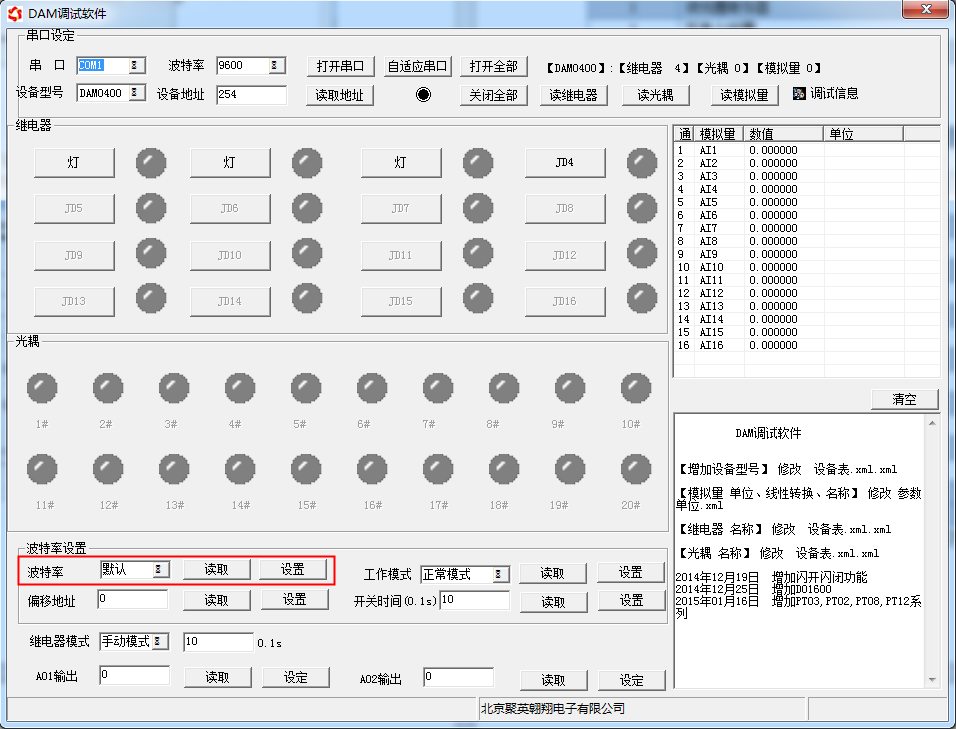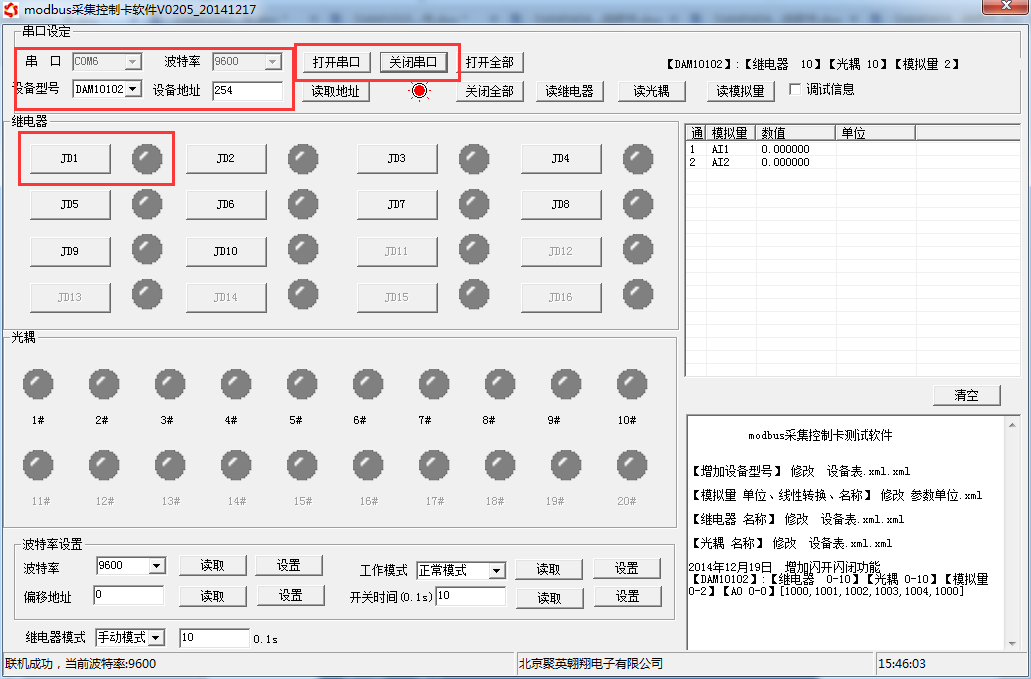 打開“聚英翱翔DAM調(diào)試軟件”;串口設(shè)定欄:串口選擇您電腦對(duì)應(yīng)COM口,波特率選擇設(shè)備默認(rèn)波特率(9600)(未自己設(shè)置過波特率前),設(shè)備地址填寫“254”(254為設(shè)備的廣播地址),設(shè)備型號(hào)選擇相對(duì)應(yīng)型號(hào),設(shè)置好以上設(shè)備的4個(gè)參數(shù)后點(diǎn)擊打開串口,點(diǎn)擊繼電器按鈕“JD1”若繼電器反應(yīng)則連接成功。
