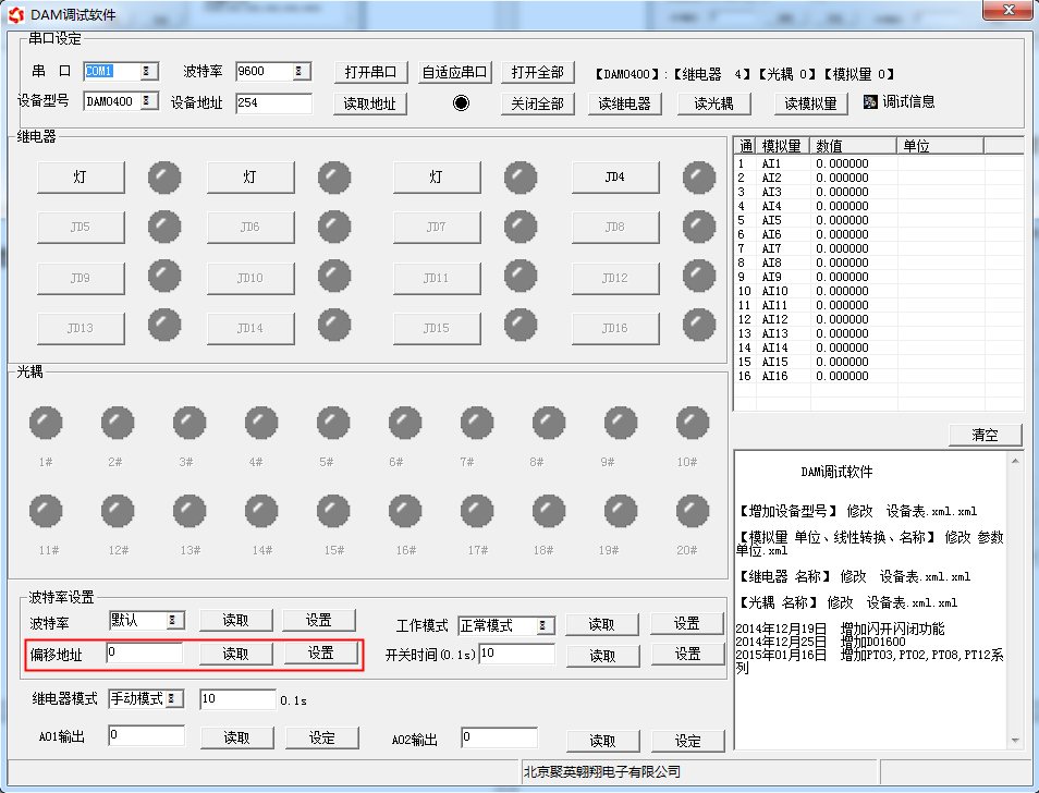 打開“聚英翱翔DAM調(diào)試軟件”;串口設(shè)定欄:串口選擇您電腦對(duì)應(yīng)COM口,波特率選擇設(shè)備默認(rèn)波特率(9600)(未自己設(shè)置過波特率前),設(shè)備地址填寫“254”(254為設(shè)備的廣播地址),設(shè)備型號(hào)選擇相對(duì)應(yīng)型號(hào),設(shè)置好以上設(shè)備的4個(gè)參數(shù)后點(diǎn)擊打開串口,點(diǎn)擊繼電器按鈕“JD1”若繼電器反應(yīng)則連接成功。