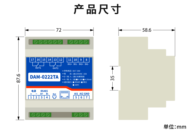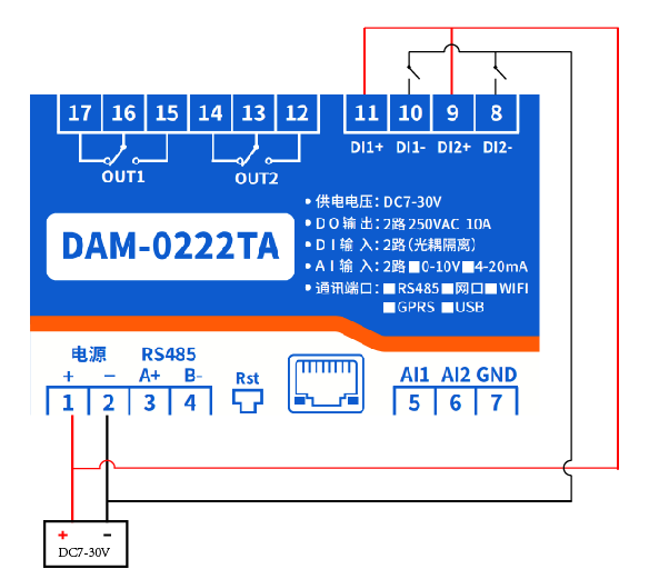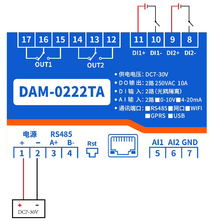 DAM0222TA 工業級網絡模塊,2路繼電器輸出(DO)2路開關量采集(DI)2路模擬量采集(Al),2路繼電器控制輸出,觸點隔離;2路開關量輸入;2路模擬量輸入;支持單網口、單WIFI、網口+WIFI三種分類;支持TCP/UDP工作方式;提供安卓手機APP...
