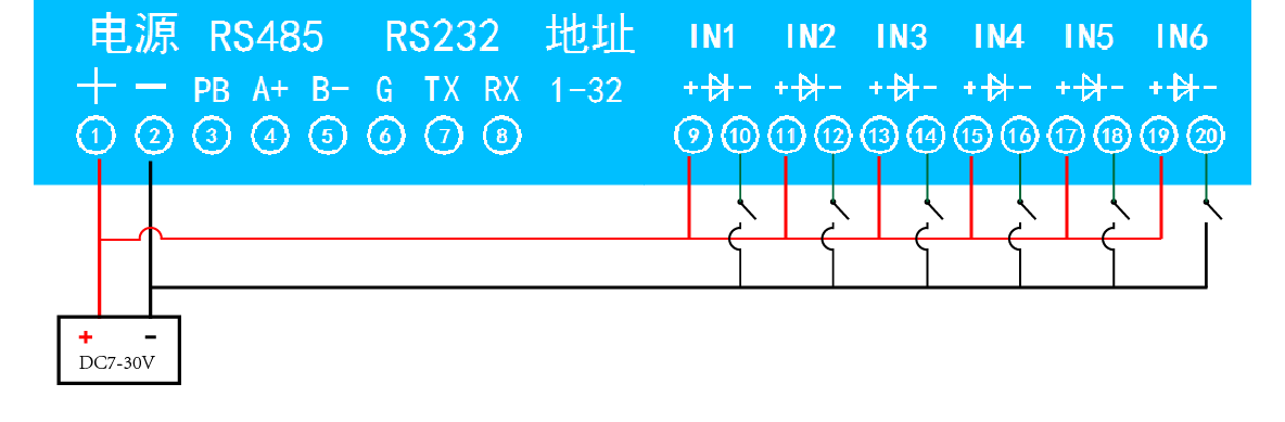模塊本身帶有光耦輸入和繼電器輸出的板卡模塊,在該模式下,光耦每輸入一次信號,對應的繼電器會吸合,其他未輸入信號光耦對應繼電器會斷開。即: