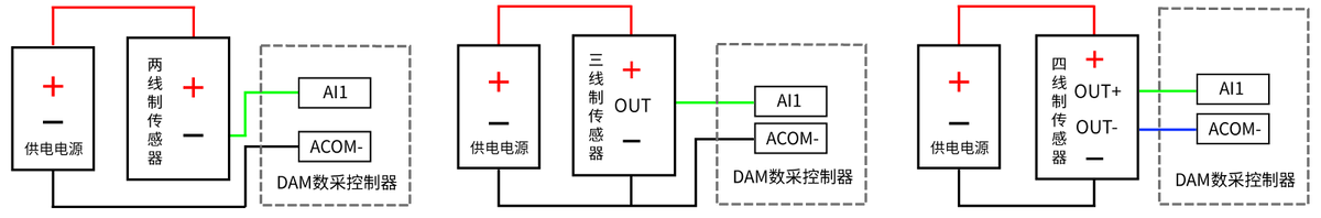 下圖中的電源部分為傳感器供電,AI1-AI8接傳感器信號正,ACOM-為傳感器信號負,ACOM+不用。