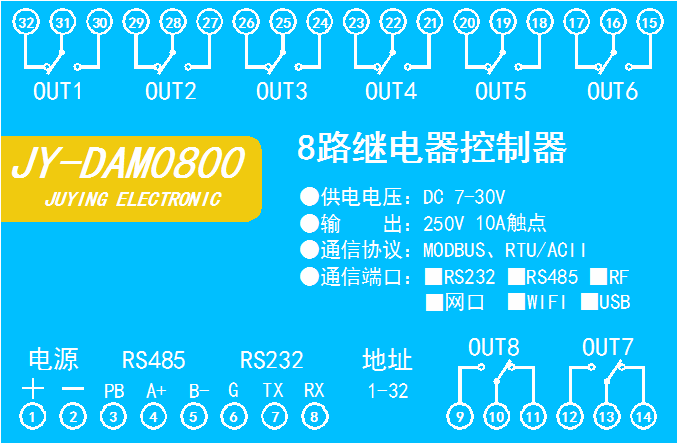 工業(yè)級繼電器控制板 8路繼電器控制(DO)DAM0800,8路繼電器控制輸出,觸點隔離;支持RS232或隔離RS485通訊接口;支持標準Modbus協(xié)議,支持發(fā)送Modbus RTU/ASCII指令;提供配套控制軟件;支持二次開發(fā);支持點動輸出。應(yīng)用于智能家...