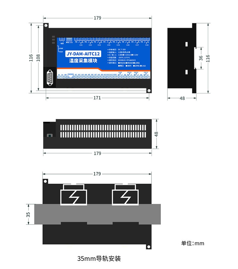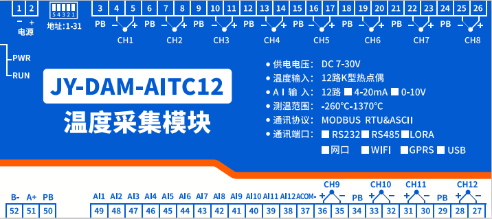 12路模擬量采集 12路熱電偶溫度數(shù)據(jù)采集 DAM-AITC12 工業(yè)級溫度采集模塊,高精度24位AD轉(zhuǎn)換分辨率0.1,測溫精度1℃,采集頻率10HZ,支持多路同時采集,應用于水溫、環(huán)境、路面、電纜等溫度采集場景