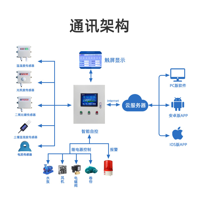 灌溉系統(tǒng)、大棚風(fēng)機控制、自動噴淋系統(tǒng)、大棚卷簾控制、智慧農(nóng)業(yè)系統(tǒng)等智能自動化,支持遠(yuǎn)程監(jiān)控、手機報警、智能自控、脫機運行、免費云平臺等功能